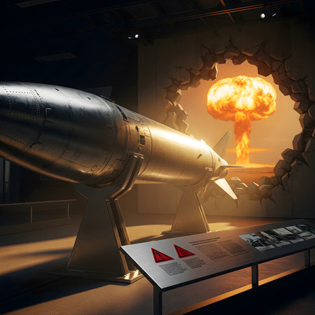 A powerful museum exhibit showcases a nuclear missile dramatically positioned in front of a simulated atomic blast. This display effectively highlights the immense destructive power and global threat of nuclear weapons, serving as a somber educational rem