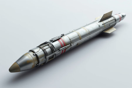 A detailed 3d render of a silver ballistic missile with a glowing red nuclear radiation symbol at its tip, symbolizing nuclear threat, war, and military power.