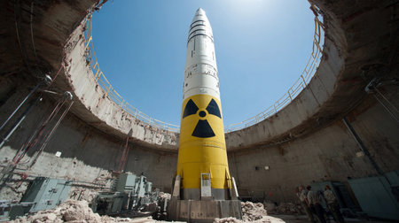 Nuclear missile standing in a launch facility surrounded by concrete walls and workers on a clear day