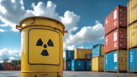 Yellow barrel with radioactive hazard symbol placed in an industrial shipping yard surrounded by colorful cargo containers under a cloudy sky.