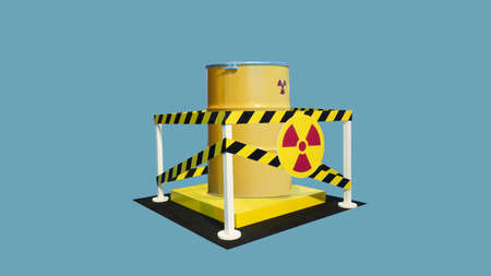 Radioactive storage tanks with a warning for chemical and radiation risks on a yellow and black backdrop.,3d rendering