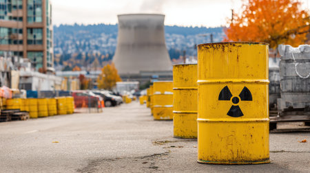 Yellow barrels with radiation symbols lined up in an industrial area near cooling towers, symbolizing environmental and safety concerns in energy production