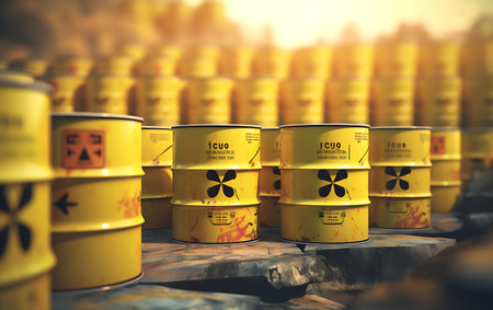 A striking image of yellow barrels prominently displaying the radioactive symbol, arranged in an industrial environment. This scene highlights the importance of safety and awareness in handling hazardous materials