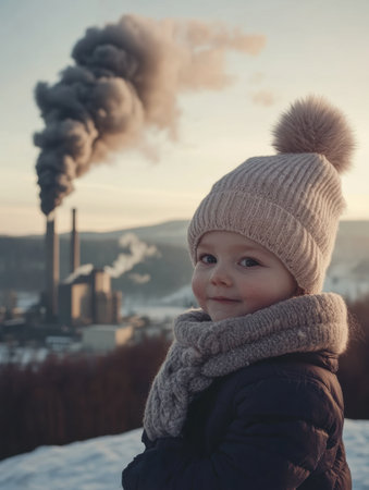 A young child wearing a knitted hat and scarf stands outdoors, smiling joyfully as smoke billows from nearby industrial smokestacks at dusk.