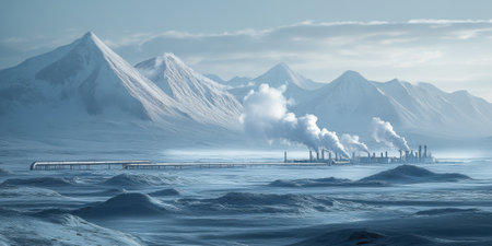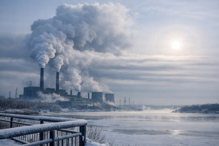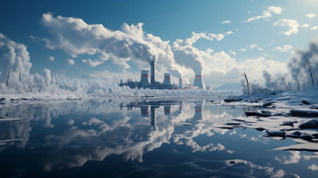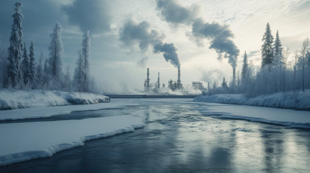 Winter Industrial Landscape with Smokestacks Emitting Smoke on Frozen River