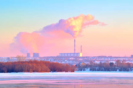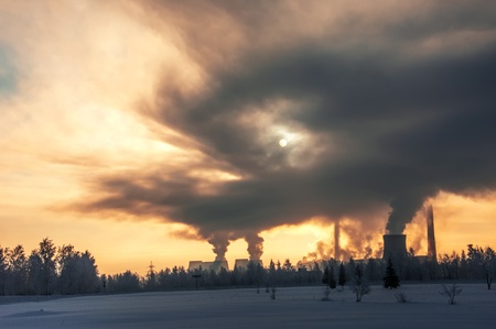 Power plant in winter at sunset. Concept of global warming and climate change