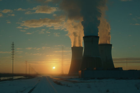 Sunset Over Powerplant With Smoke Plumes and Winter Landscape Revealing Energy Generation Infrastructure During a Chilly Evening Generative AI