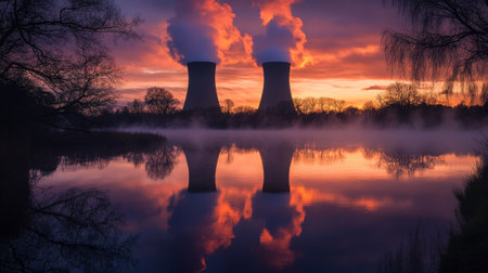 At dusk, a nuclear power plant towers with billowing smoke, reflected in calm waters, surrounded by serene landscape and illuminated by warm twilight hues.