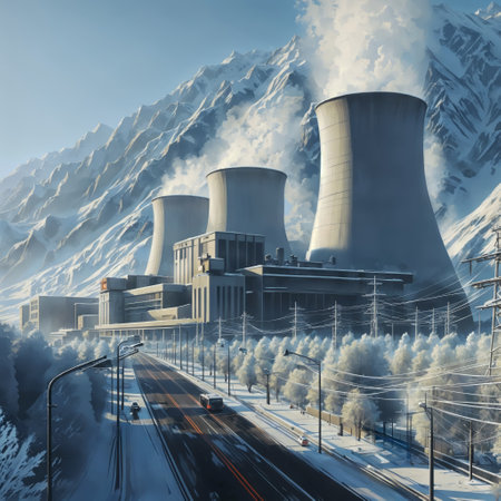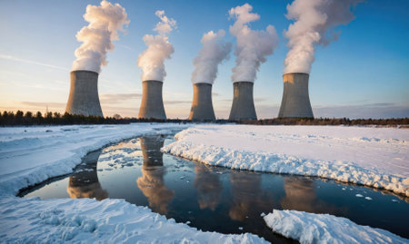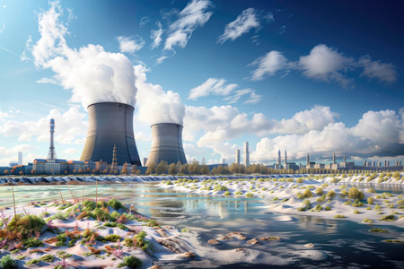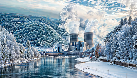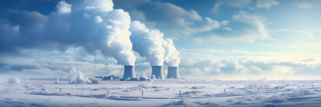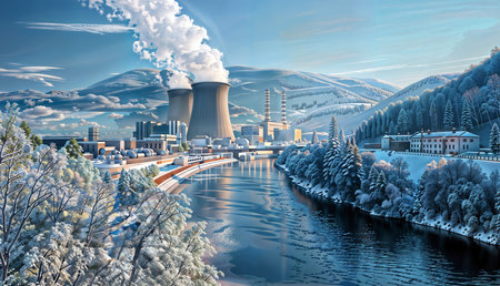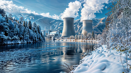 Nuclear Power Plant in Snowy Landscape with River and Mountains: A Breathtaking and Scenic Image of the Winter and the Power