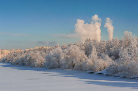 Winter landscape with frosty trees in city park and smoke of factories