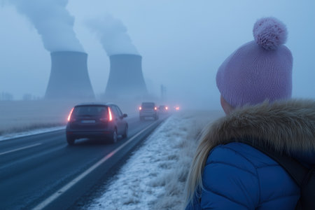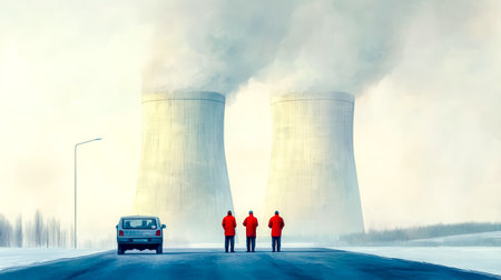 Three engineers in red jackets are monitoring the activity of a nuclear power plant's cooling towers emitting steam on a cold winter day, with a car parked nearby on the access road