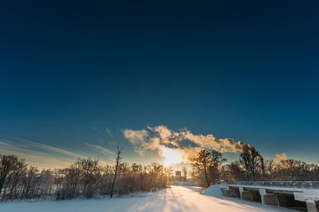 It is very cold in the morning sunrise industrial landscape. Polluting the atmosphere.