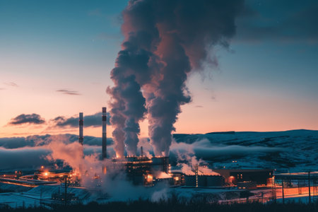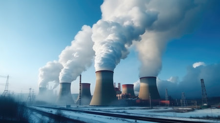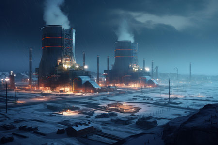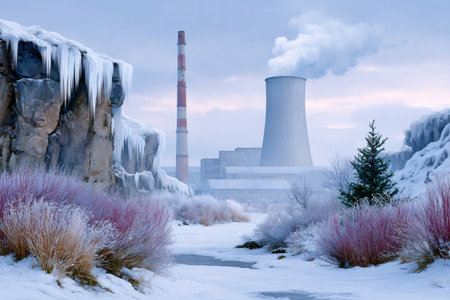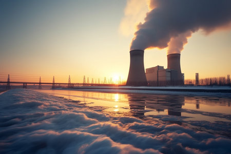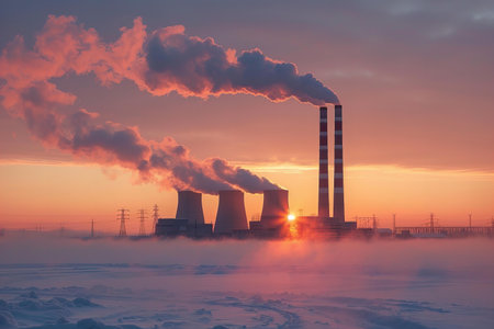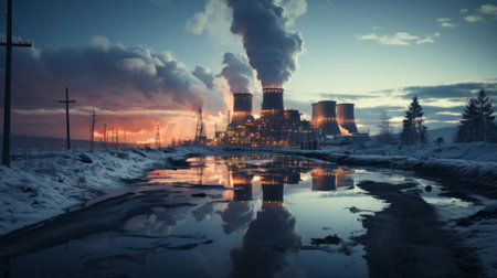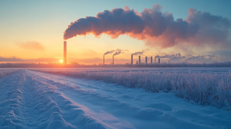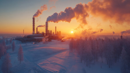 Industrial Powerplant at Sunrise With Smoke Rising From Towers Against a Snowy Landscape in a Cold Climate Generative AI