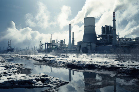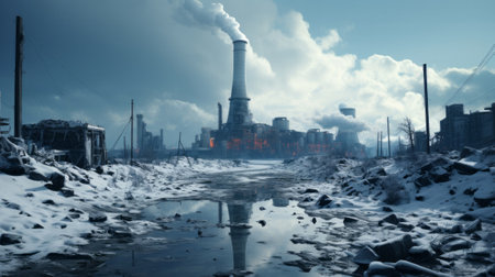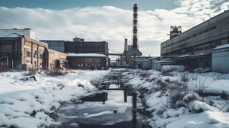 A factory with smoke stacks and snow. Generative AI.