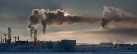 Smoke from the chimneys of a steel plant in winter at sunset.