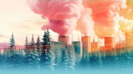 Factory smoke covering pine forest. Generative ai