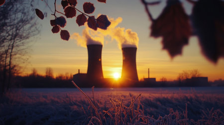 The silhouette of cooling towers against a glowing winter sunset, with frosted leaves in the foreground, capturing the stark contrast between industry and nature in winter
