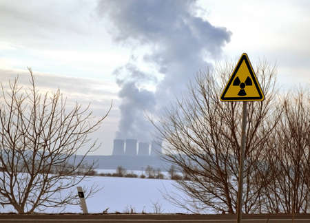 A woman looks at a nuclear power plant in winter. The concept of environmental pollution.