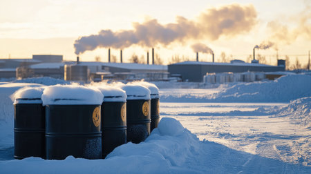 This captivating winter scene features snow-covered drums near an industrial factory. The rising sun casts warm light on the cold landscape, enhancing the atmosphere.