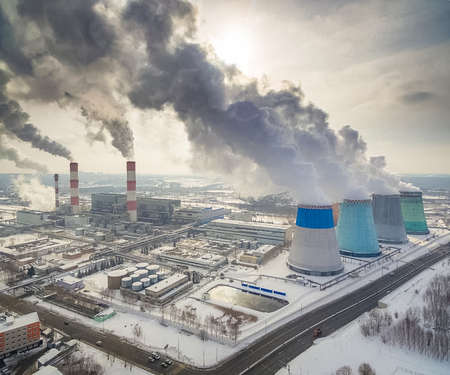 High Smoking thermal power plant stands on the snow and pollutes the environment in winter