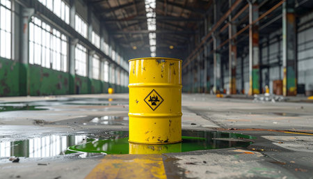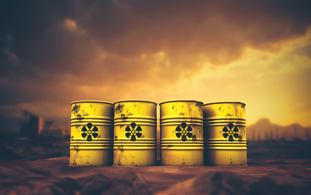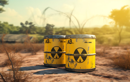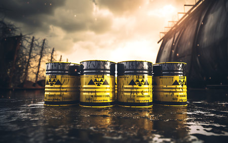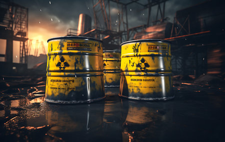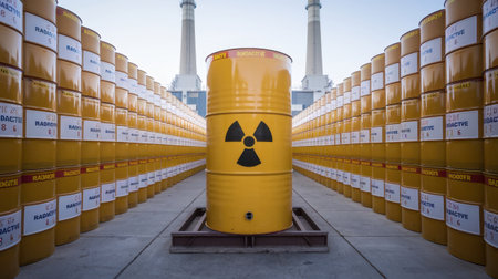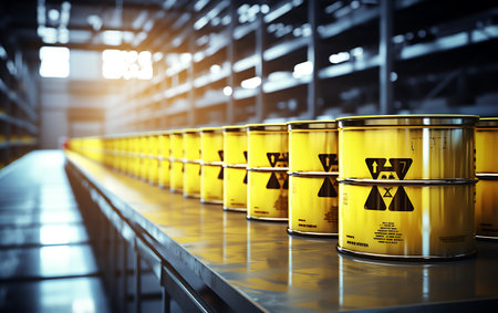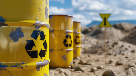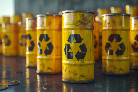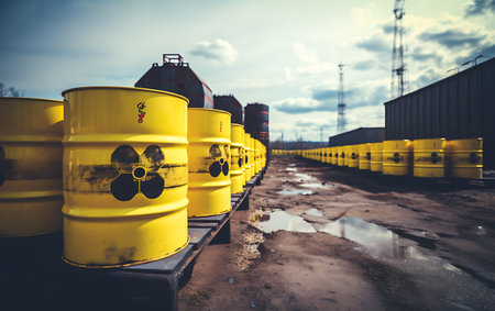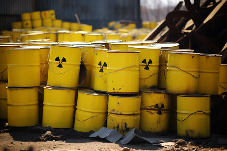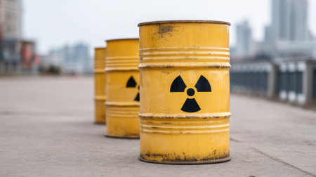 A striking image of yellow barrels prominently displaying the radioactive symbol, arranged in an industrial environment. This scene highlights the importance of safety and awareness in handling hazardous materials