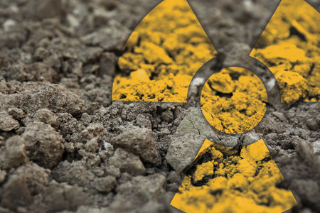 Orange radioactive sign on soil, closeup view. Radiological pollution