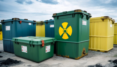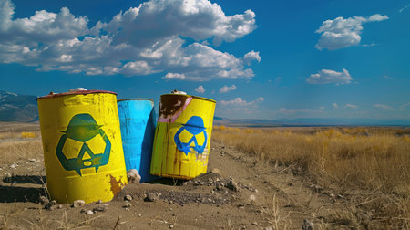 Brightly colored hazardous waste containers with radioactive symbols, securely placed in an outdoor setting, signaling the need for careful disposal.. AI Generation