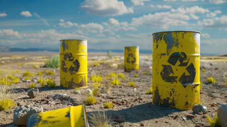 A vivid scene featuring yellow recycling barrels scattered across a dry desert landscape, embodying themes of sustainability and environmental awareness.