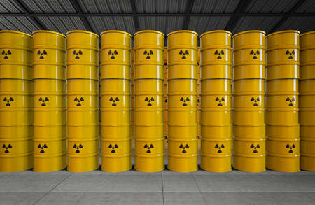 Stack of yellow radioactive waste barrels in disposal zone or final storage, 3D illustration