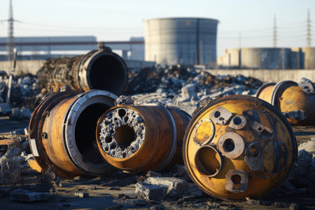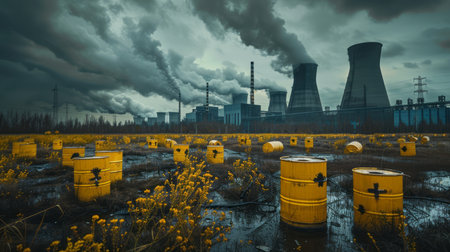 Industrial scene with barrels of radioactive waste, environmental pollution concept.