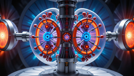 A highly detailed, futuristic fusion reactor core featuring glowing red and blue energy spheres encased in transparent globes, surrounded by intricate metallic machinery with an advanced, symmetrical design.