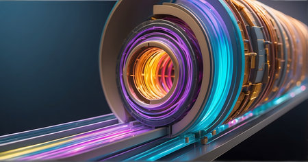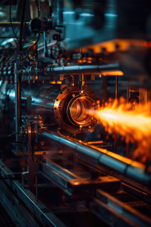 This image showcases intricate machinery with colorful lights reflecting off shiny metallic surfaces, capturing the essence of modern industrial technology and innovation.