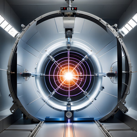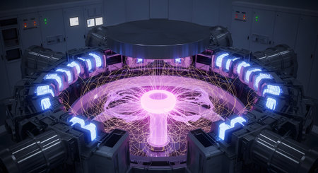 A sophisticated fusion reactor is shown in a high-tech research facility.