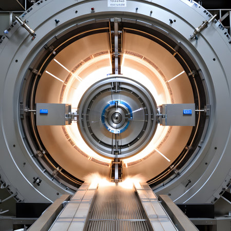 An awe-inspiring top-down view of a glowing blue and white plasma ring inside a tokamak, a type of fusion reactor. The complex machinery and intense light represent cutting-edge scientific research in nuclear energy, power generation, and futuristic technology.