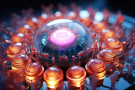 An image showcases a central energy sphere radiating beams of bright light within a complex arrangement of metallic structures. The scene is illuminated with a cool color palette featuring blues and reds, suggesting a high-tech environment. This visual is suitable for conceptual applications in science, technology, or design.