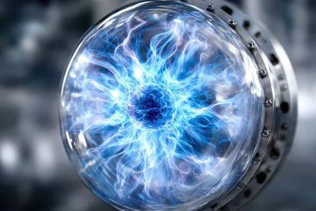 A scientific experiment shows vibrant blue plasma filaments arcing across a glass hemisphere, likely a tokamak fusion reactor. An electrical spark flashes on the side, illustrating concepts of nuclear energy, advanced physics, and breakthrough technology.