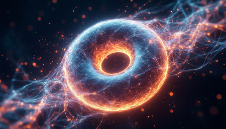 Complex visual of atomic structures intertwined with cosmic elements in vibrant colors and patterns.