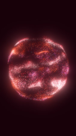Abstract red and pink glowing sphere made of countless light particles symbolizing digital energy and transformation.