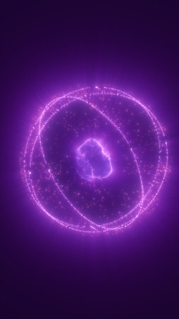Glowing purple energy sphere surrounded by orbiting light trails, symbolizing atomic power or digital energy.