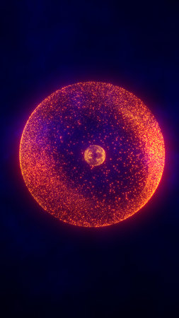 Orange energy sphere with glowing bright particles, atom with electrons and elektric magic field scientific futuristic hi-tech abstract background.