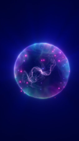 Abstract sphere atom with electrons flying glowing bright particles and energy magic field, science futuristic hi-tech background.