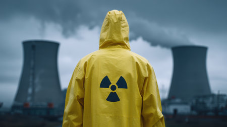 A solitary figure wearing a yellow raincoat stands against a backdrop of a nuclear power plant. The dramatic grey sky and towering emissions create a striking environmental theme.