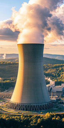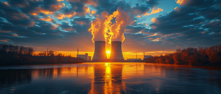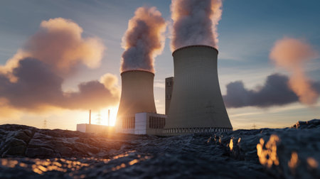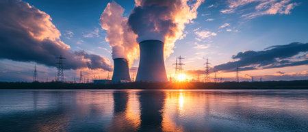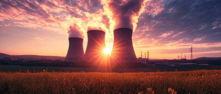 A stunning view of a nuclear power plant during sunset, featuring two prominent cooling towers releasing steam into the atmosphere. The scene captures the blend of technology and nature, highlighting the importance of energy production