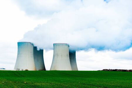Temelin, Czech republic - 02 28 2021: Nuclear Power Plant, Steaming cooling towers in the landscape at sunset, road leading to factory in foreground