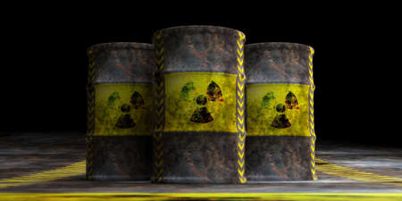 Toxic waste concept. Radiation symbol on oil barrels, dark background. 3d illustration