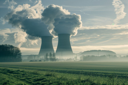 Majestic cooling towers release whisping clouds into a serene morning sky, framed by lush fields and distant hills of an early autumn landscape. Generative AI