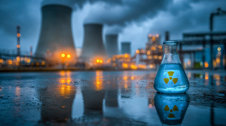 View of nuclear power plant with cooling towers emitting steam and red radiological symbol reflecting the complex relationship between energy production and environmental concerns.