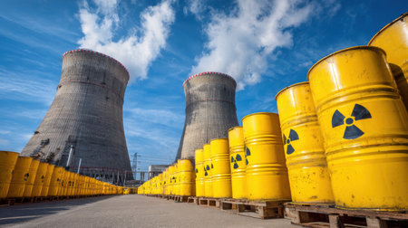 Industrial Site with Cooling Towers and Yellow Radiation Warning Barrels against a Blue Sky Background