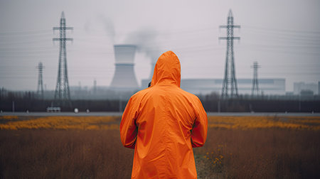 Person in yellow hazmat suit and gas mask looks at nuclear tower. Concept of radiation danger, pollution, or apocalypse. Suitable for environmental or sci-fi themes.