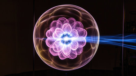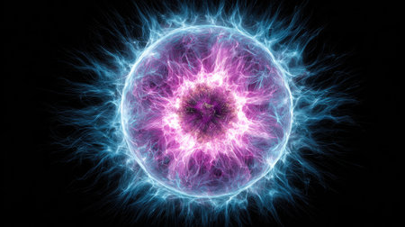 A vibrant image depicts a glowing energy sphere with intricate electrical effects. The composition features a central plasma ball radiating with blue and purple hues against a dark background. This could be used for scientific illustrations, futuristic concepts, or designs relating to energy.
